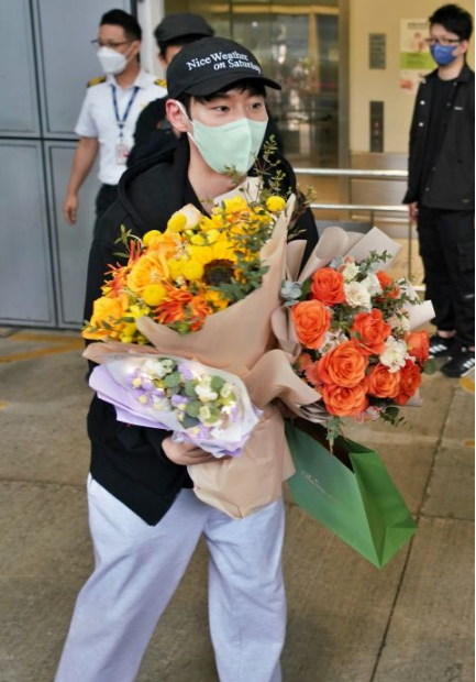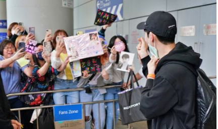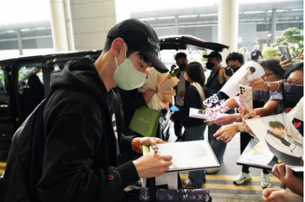今日(13日)上午约11时45分,李帝勋以一身轻松运动装束抵达香港机场,并在助手和保安的护送下前往登车位置,半百影迷夹道欢迎,令他相当惊喜;期间不少粉丝大叫他在《模范的士 2》(模范计程车2)的角色名称「王道吉」,逗得他合不拢嘴!为回应粉丝热烈支持,李帝勋亲自接过花束及礼物,又主动为影迷签名,更两度拉下口罩单眼派心,引发全场尖叫!