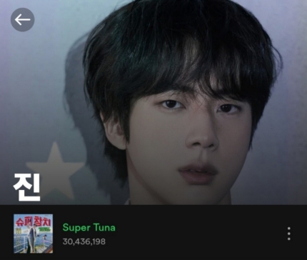 韩网讯/防弹少年团(BTS)Jin的自作曲《超级金枪鱼》(Super Tunar)在Spotify上突破了3000万点击率,在全球范围内大受欢迎。