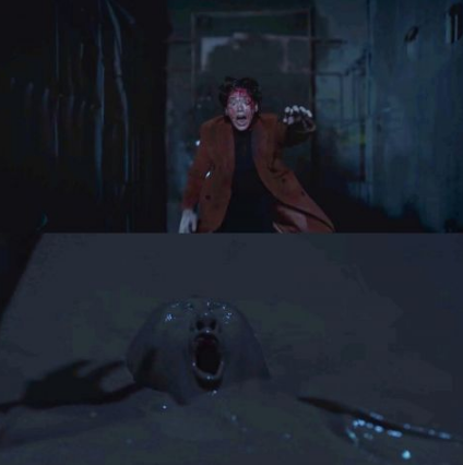 剧中全宰寯盲著眼被河度领推入水泥槽,就此殒命与混凝土融为一体。 拍摄时剧组从西海岸运来大量细腻的淤泥以做出水泥的视觉效果,朴成勋亲自上阵、吊著威亚栽整个人进淤泥中,完全没有用到替身!