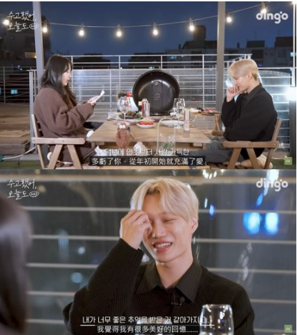 边享用晚餐边闲聊,柳安趁著机会拿出生日派对那时没能拿给KAI的手写信,内容写到你总是真心回报得到的爱,我喜欢了9年的钟仁欧巴依旧不变是个帅气的人、托你的福,从年初又一起分享充满了爱与幸福的记忆,接下来要以这份回忆为基础更加努力生活,KAI听了忍不住红眼眶,觉得比起自己给柳安的,自己得到了更多美好回忆。