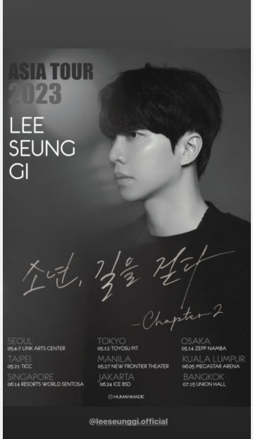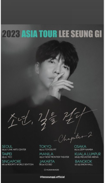 韩网讯/ 李升基所属社HUMANMADE於30日宣布:李升基将於5月展开2023年亚洲巡回演唱会《少年,走在路上-Chapter2》。