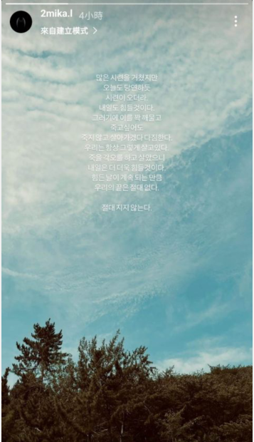 先前曾为23点发声的大国男儿队长Mika,上午再次发布了一则限时动态:虽然历经许多考验,但今天也理所当然会遇到试炼,明天同样会很辛苦。所以才咬紧牙关,即便想死也决心活下去。我们总是那样生活。做好死去的觉悟而活著,就算明天更加疲累、艰难的日子会持续下去,我们绝对没有尽头。绝对不认输。