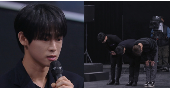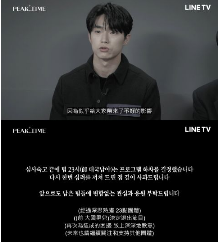 韩网讯/ 《Peak Time》由於阵中参赛者23点大国男儿中的Karam私生活遭非议,7日由制作组宣布全员下车,昨晚(12日)播出的第10集公开三人道歉画面。