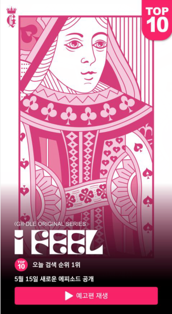 当天公开的海报像是扑克牌的皇后,特别是左上角还放了代表 (G)I-DLE 的字母G,而不是代表皇后的Q。此外,右上角的TOP 10、下方的 (G)I-DLE ORIGINAL SERIES、今天搜寻排名第一、5月15日公开新曲等句子让人联想到 OTT 平台主画面,让人更加好奇新专辑会是什么样的风格。