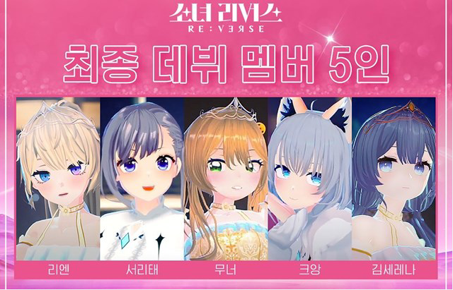 FE:VERSE是偶像生存节目《GIRL'S RE:VERSE》推出的五人虚拟女子团体,三月初决定了出道获胜者,获胜者包括Muneo(무너,前IZ*ONE权恩妃)、Seoritae(서리태,A Pink夏荣)、Keuang(크앙,宇宙少女Luda)、Rien(리엔,前本月少女姬振)、Kimserena(김세레나,宇宙少女秀斌)。