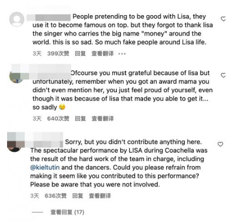 没想到LEE JUNG的这几张照片竟然引来了部份国外粉丝的不满,他们觉得这明明是BLACKPINK的舞台,LEE JUNG却说得像自己的舞台一样,让人很不爽。早前在2021MAMA上,LEE JUNG凭藉LISA的《Money》拿下了年度最佳编舞奖,但却在发表感言途中完全没有提及LISA,这两件事情都引起了LISA部份粉丝的不满,国外粉丝用英文留言称:所作所为都把自己当作这首歌的主人,拿奖的时候也没有向LISA表达谢意、 比起说是为BLACKPINK应援,更像是在炫耀你自己等。 看到这些留言的LEE JUNG最终把原先写在文中的also seeing you performing my choreography at Coachella删掉。