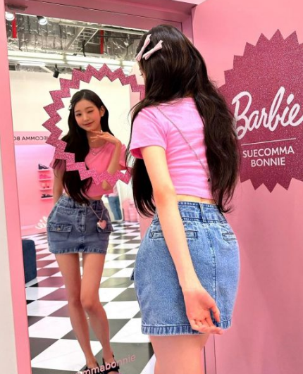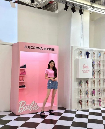 她俏皮可爱又充满青春活力的造型,站在展示柜前与芭比娃娃们合照,尤其是以大型玩具盒为背景的照片,彷佛就像是真人“芭比(Barbie)”一样。