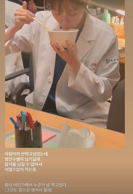 日前,李圣经通过个人IG账号公开了一则短片,并附文写道:一早上其实并不想吃饭,但是郑仁秀老师剩下了,食物绝对不可以剩下,没办法我只能吃掉了。 影片中李圣经穿著医生白袍,坐在办公桌前大口大口地吃著泡面,吃相令人秒回《举重妖精金福珠》时期。 李圣经还吐槽称经常感觉有人在拍我(而且是拉近景偷偷拍摄)。