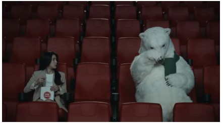 第三段CF,林智妍来戏院看北极熊纪录片,片中一对母子正在经历分别,因为妈妈要喝可乐而儿子要喝茶XD这是邻座又出现那只白熊,对著荧幕哭喊:妈妈!林智妍再次傻眼。