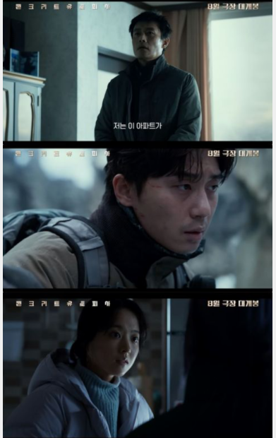 公开的预告:因大地震所有的一切都变成废墟的首尔,在唯一生存下来的公寓里,爲了生存而必须守护自己的居民们的样子。李秉宪、朴叙俊、朴宝英从未见过的全新面孔和角色变身给人留下了深刻的印象,让人期待他们的合作,再加上金善映、朴持厚、金度允的加入,阵容真的超坚强!