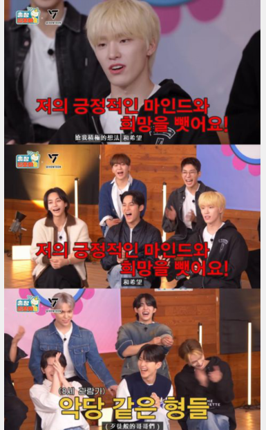 上次完整体出演《出差十五夜》时,罗PD问Dino最近有没有物品被哥哥们抢走?Dino回覆:哥哥们不抢实体物品的,比起物品…(哥哥们)会抢走了我的积极心态和希望引发全场大爆笑。