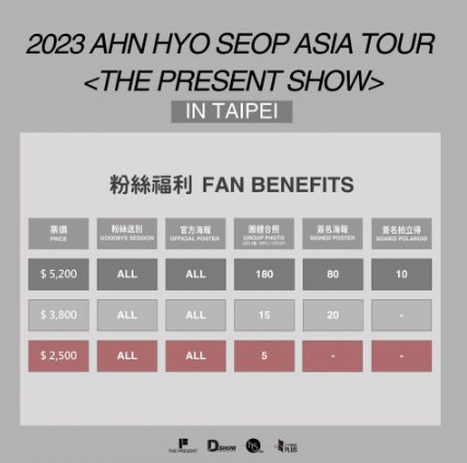 主办方强调B区及C区会架高,票价为A区$5,200 / B区$3,800 / C区$2,500。而粉丝们最关心的福利也相当不错,全场均有粉丝送别(据往常经验,艺人会在定点与即将离开的粉丝们挥手送别)及官方海报(可以带回家收藏的小礼物!)。这或许是最接近安孝燮的一次,喜欢他的粉丝们可要记得进场支持~