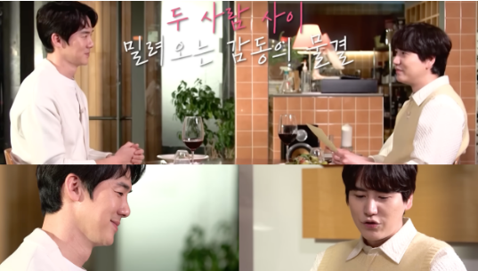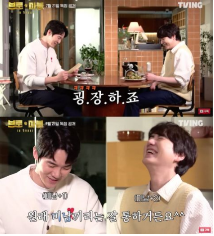 曺圭贤写道我的朋友演锡~是爱情片、动作片、犯罪惊悚片,不分题材的演技天才,特别是演锡的吻戏,特别厉害!念到吻戏这段柳演锡还害羞笑了。曺圭贤提到两人是通过音乐剧认识,因为有很多共同点,所以很快就变亲近了,还强调本来美男之间很快就相通的。