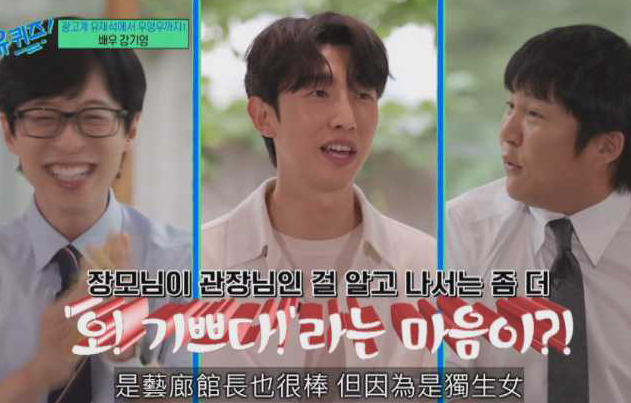 曹世镐随后搞笑问道你一开始认识你太太的时候,应该不知道她妈妈是艺廊馆长吧,没想到姜其永竟然接下这个梗,配合回答道是艺廊馆长也很棒,但因为是独生女我好像更开心综艺感爆棚的回答让全场都相当满足。