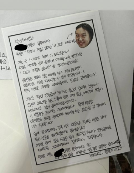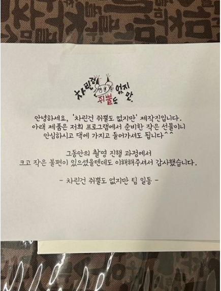 她接著说:拍摄过程中,关於造成的噪音、外部公寓讯息暴露等等,应该给你们带来很多不方便吧...虽然我们已经尽量注意这些部分,但是拍摄上好像不能完美地照顾所有居民,所以非常抱歉。最后李泳知说带著抱歉和感谢的心情准备了小礼物,托大家的福,诞生一个备受喜爱的节目,再次感谢大家的理解,很抱歉。