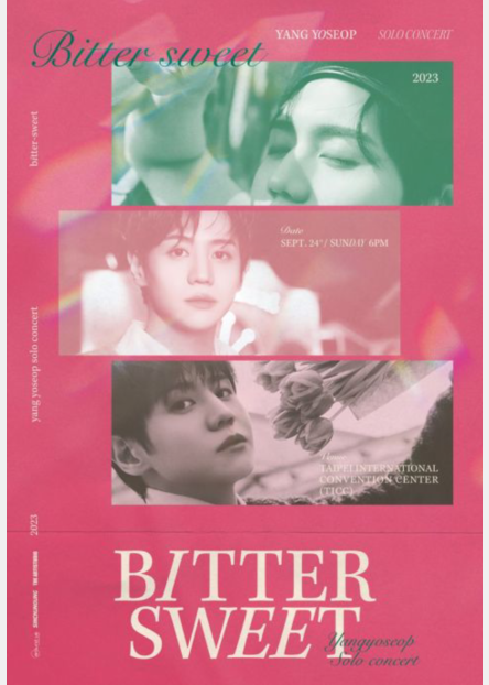 自2018年於首尔与东京成功举办完个人CONCERT后,梁耀燮每一肢体律动所散发出的魅力,加上细腻的美声嗓音,都总是让台下粉丝感动不已,时隔五年,梁耀燮日前於6/10、11两天於首尔,7/20、21两天於东京举办了个人SOLO CONCERT,由於经典好歌太多,因此更增加这次CONCERT的期待与丰富度,这次移师台北举办,粉丝务必不能错过!韩系人气实力团Highlight全才成员梁耀燮,订於9/24晚间六点,在TICC台北国际会议中心举办2023 BITTER SWEET:YANG YOSEOP SOLO ConCERT in TAIPEI。