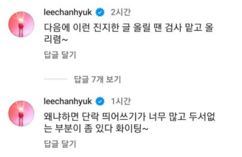 然而灿赫的回覆却令画风一转:下次再PO这种严肃的文之前,先给我检查一遍吧~因为分段太多,且有些缺乏头绪的部份。加油~