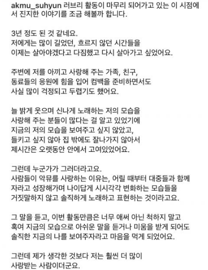 秀贤今日在IG更新长文:好像有3年了。 对我而言漫长的、停滞的时间。