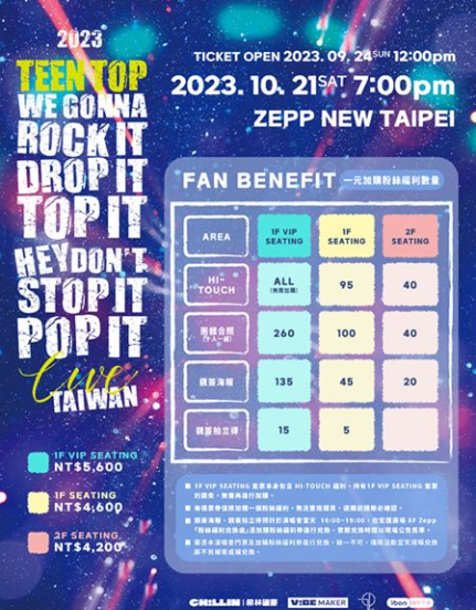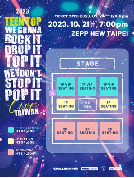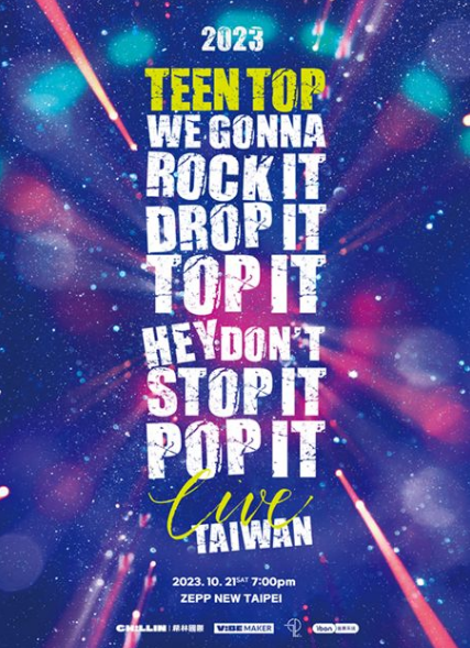 TEEN TOP 将於 10 月 21 日(六)来台在 Zepp New Taipei 举办 2023 TEEN TOP ConCERT IN TAIWAN “we gonna rock it drop it top it hey don't stop it pop it LIVE”演唱会,演唱会门票将在 9 月 24 日中午 12 点在 ibon 售票网站及全台 7-11 ibon 机台开卖,,TEEN TOP 除了将带来多首经典歌曲,也将带来今年发行的新歌舞台,粉丝们务必把握这次的演唱会。