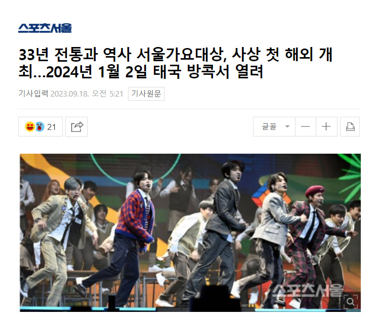 消息称,拥有33年传统和历史的《首尔歌谣大赏》将首次在海外举行。18日首歌大组委会表示:“第33届《首尔歌谣大赏》将于2024年1月2日在泰国曼谷拉加曼加拉国家体育场举行。”这也是该颁奖典礼首次在海外举办,让人十分期待。