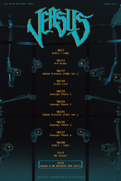VIVIZ将于11月2日在各大音乐网站发布第四张迷你专辑《VERSUS》。《VERSUS》是VIVIZ继今年1月推出第三张专辑后时隔10个月发行的新专辑,今天公布的回归预告海报以游戏风格的画面呈现了该专辑的整体风格。
