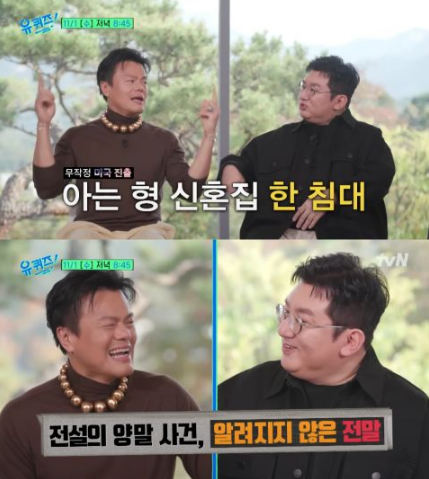 朴轸永回忆当年去美国开拓市场期间,两人一起住在朋友的新婚房、睡同一张床,并排躺下时距离就只有现在这么近。 因为朴轸永工作较忙、房时赫负责家务,房时赫多次抱怨朴轸永不要把袜子翻过来,最终怒气爆发离家出走,这就是广为流传的袜子事件。 房时赫笑称:有人说如果没有这件事,也许K-POP的历史都要改写。