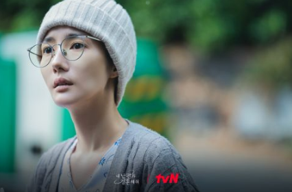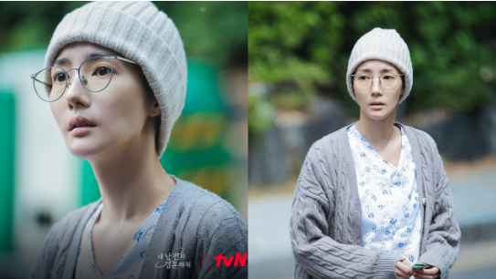 剧照中,姜智媛穿著病患服装、戴著帽子,瘦削凹陷的脸颊和苍白的面色暗示她在艰难的治疗和疲惫的生活中即将崩溃。