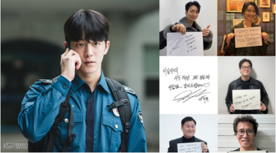首先,饰演模范警校生金智勇兼暗夜中治安维持者的男主角南柱赫,目前正在服役中,也特别写下了亲笔留言: 衷心感谢所有喜爱《非法正义》的人。以及刘智泰(赵宪)李浚赫(赵江旭)金素辰(崔美丽)等人,主演们都以演技征服了观众的心:谢谢大家的喜爱、感谢大家陪伴我们到最后写下了对观众们支持的感谢话语。