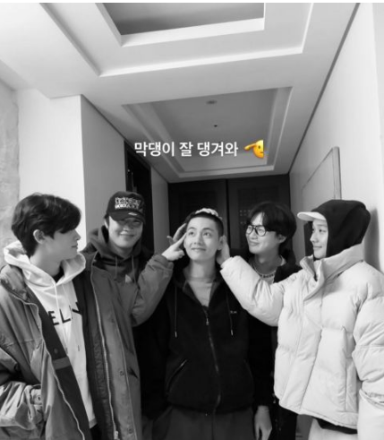 而V在今日(11日)入伍,Wooga Family的哥哥们朴叙俊、朴炯植、崔宇植、Peakboy在他入伍前也一起聚会了。朴叙俊今日公开5人合照,并写下:忙内~好好回来。