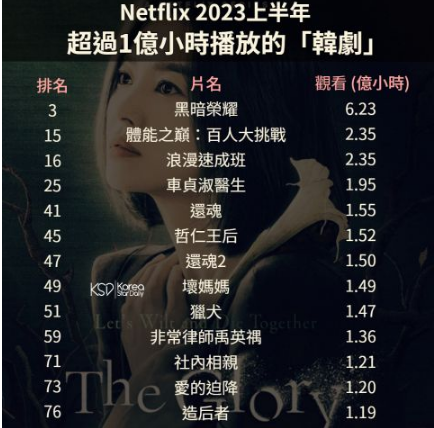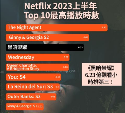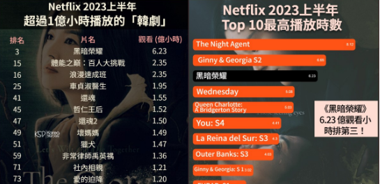 以下帮大家综合 Netflix 2023上半年:Top 10 观看时数影片超过 1亿次观看时数的韩剧最多人看的十位中,《黑暗荣耀》以6.23亿次观看排名第三,一部韩语影片可以有如此高的观看次数真的很厉害。