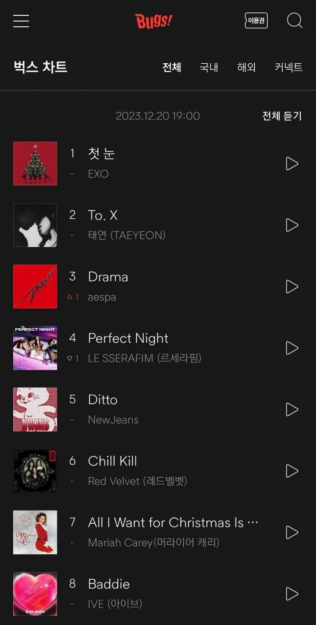 或许是随著Challenge热潮,加上韩国正好下雪相当应景,再加上原唱加入Challenge阵容,EXO〈初雪〉原曲在各大排行榜悄悄逆袭一阵子后,昨(19)日登上了Melon TOP100第一,今日再拿下Melon日榜第一名!目前也稳坐bugs排行榜第一。EXO还成为2023年第一个也可能是唯一一个Melon日榜夺冠男团,〈初雪〉也变成EXO继〈Growl〉(2013)、〈十二月的奇迹〉(2013)后第三首日榜夺冠的歌曲,也是EXO相隔10年继〈十二月的奇迹〉再拿日榜一位的作品。