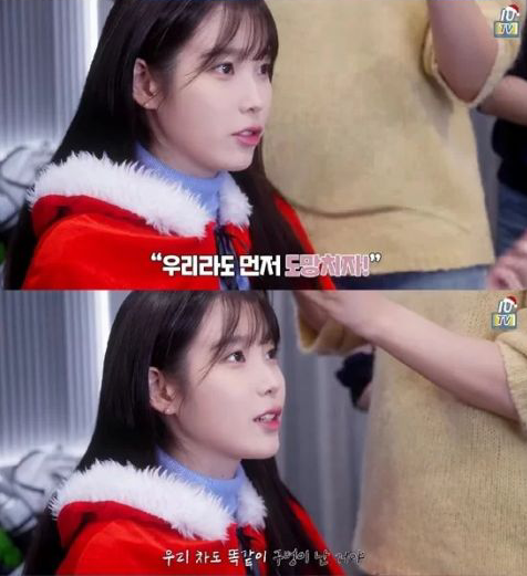 IU亲自解释说:其实是打算逃跑的,(只是发现了)车轮上有个洞,最搞笑的是V的车先有洞,所以我俩就说不然我们逃走吧,没想到我自己的车后来也有了同样的洞,为了不让我们逃跑,片场各个角落都放了类似玻璃碎片之类的东西。