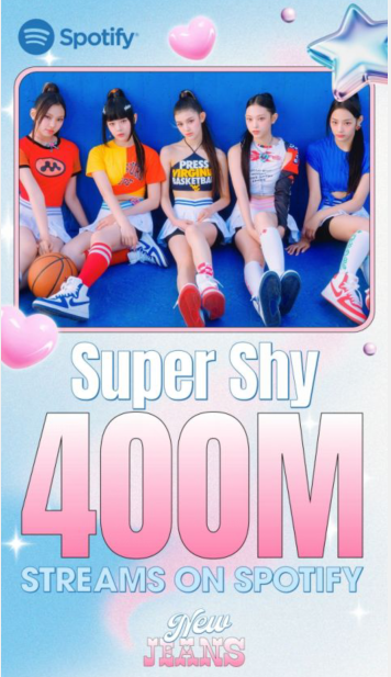 韩网讯/ 今早最新消息,人气女团 NewJeans 的热门歌曲〈Super Shy〉在1月3日 Spotify 上播放量正式突破四亿(4亿8万9304次),写下团队的新纪录。