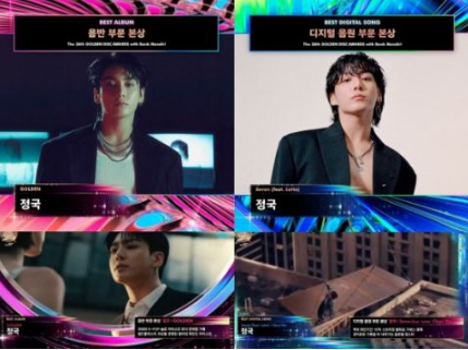 此外,柾国入伍前的音乐作品也在各大颁奖典礼上获奖,最新的获奖讯息是在1月6日举行的《第38届金唱片奖》上拿下两项大奖,专辑《Golden》拿下专辑部门本赏,热门曲〈Seven〉拿下音源部门本赏,两项含金量极高的殊荣,同时也是第一位在金唱片奖上夺下两项大奖的男solo。