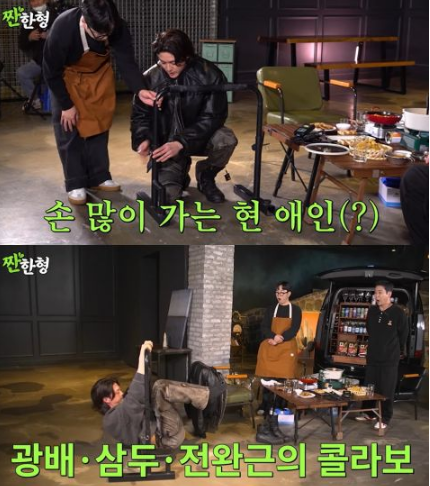金智勋勤於健身的成果也是有目共睹的,申东烨提到自己运动总是无法持久,金智勋突然教练魂上身,说要现场教大家运动,甚至直接到车上拿出健身工具来!金智勋忙著架设调整健身工具,申东烨却还继续大口吃肉喝汤,金智勋为了示范健身动作,脱下了外套,整理了一下头发还兼补妆,还脱掉了靴子想要更贴近自己平时运动的打扮,让申东烨赶紧说「现在节目都只拍上半身」引发大笑。