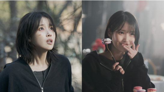 而另一张剧照中,IU 展现出截然不同的形象,整洁的发型和妆容充满生气。 在餐厅的背景下,她用手擦拭著嘴边的奶油,笑容明朗而幸福。