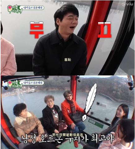 缆车上,话题也离不开金承洙的好,妈妈甚至说:我家孩子虽然年纪大,但有看过之前几集《熊孩子》吗?他男性贺尔蒙指数最高!灰衣粉丝掩面,粉衣粉丝则拍手说:我看过那集!全都忍不住笑出来,金承洙难为情到了极点说:两位也许是为了等待命中注定的相遇才来,结果遇到我们……结果灰衣女粉丝回应:这就是命中注定的相遇啊!又打中妈妈和阿姨们的心。