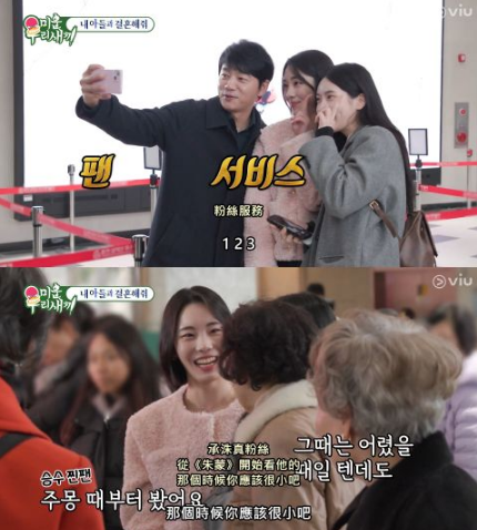 《我家的熊孩子》最新EP.381,金承洙带妈妈、两位阿姨一同出游,在排队搭缆车时遇上了两名女粉丝,粉丝想和金承洙合照,金承洙马上答应了,亲切的拿了她们的手机自拍,粉丝见到真人也频频赞叹「真的很帅呢」。粉丝还表达自己从《朱蒙》(2006)开始就很喜欢金承洙,和阿姨们便聊了起来,还一起搭同一台缆车。