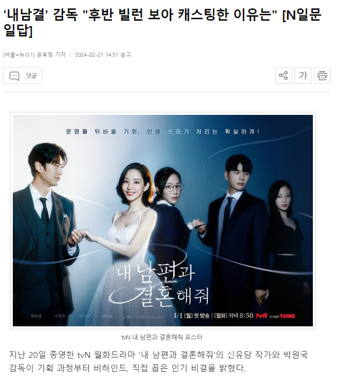 近日,电视剧《请和我老公结婚》正式完结,该剧自播出以来一直都是大众很关注的一部剧,获得了好口碑和高收视,打开了tvN电视台的开门红。不过,自从BoA饰演的男主角的未婚妻吴宥拉登场之后,该剧的口碑就急剧下滑,收视率也罕见地下降了,引发了部分剧迷的不满。而在该剧大结局之后,导演也谈及了BoA邀请出演该剧的原因。