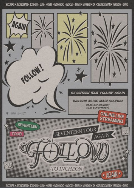 另外,SEVENTEEN将在今年上半年举办演唱会SEVENTEEN TOUR 'FOLLOW' AGAIN,首先於3月30日至31日在仁川亚运主运动场开唱,5月18日至19日在日本大阪长居陆上竞技场演出,随后与5月25日至26日将在神奈川日产体育场与当地粉丝见面。