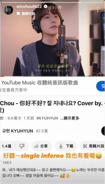 周兴哲在IG限时动态附上圭贤cover〈你,好不好?〉的影片画面,写下好听~single inferno我也有看喔(笑脸),不仅给予肯定,也表达自己追了圭贤主持的Netflix综艺《单身即地狱》。