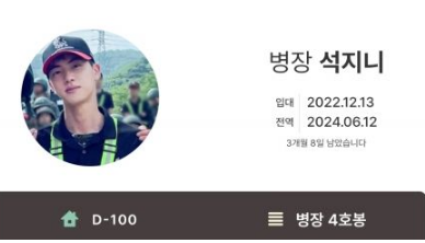 目前在陆军第5步兵师新兵教育队作爲助教服役的 Jin,以4日爲基准,离退伍(6月12日退伍)还有100天。这也让粉丝们纷纷表示:哇 时间疯了吗、想听硕珍亲切的声音、剩下的成员们也这样度过时间的话,一个接一个地出来、好想快点见到我的孩子、100天也很长、昨天还在看演唱会影片呢、过了1年6个月!如果有事先准备好的东西的话,确实空白期更短、明天就要进入两位数了等等。