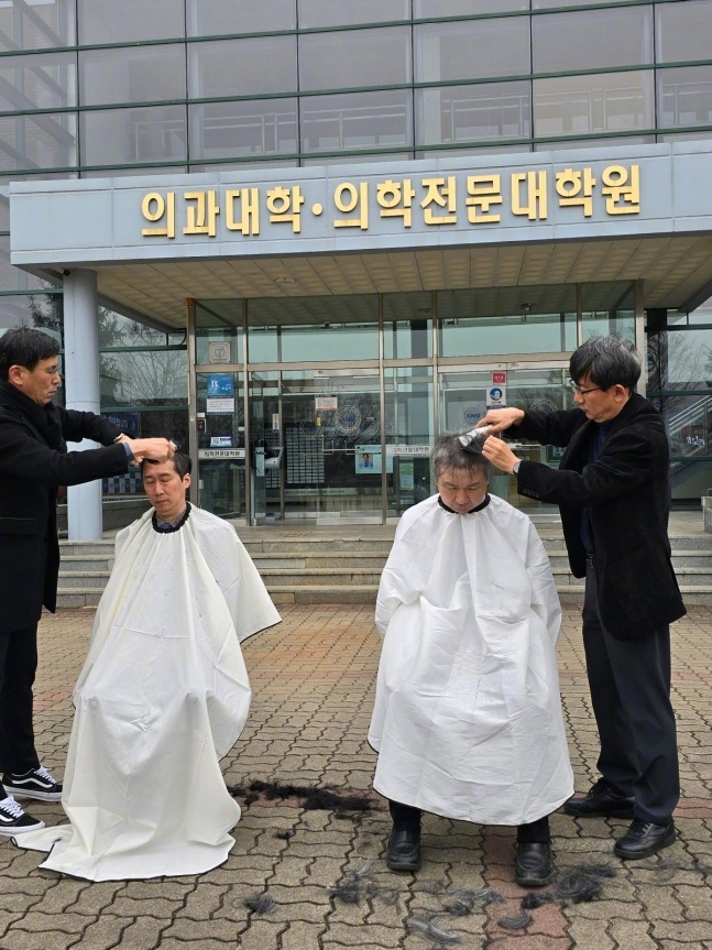 江原大学医学系的两名教授在江原大学医学院前举行削发仪式,反对大学单方面决定扩增规模。