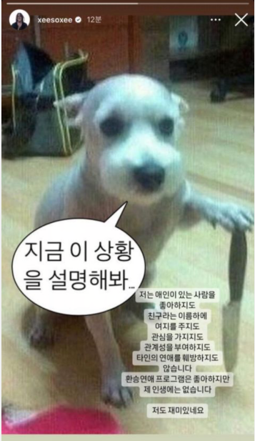 下午,韩韶禧在 IG 限时动态上传一张小狗拿著看起来像是凶器一样的玩具,对话框写著说明一下现在这个情况的照片。她写道:我不喜欢有对象的人,也不会借著朋友名义给予余地、给予关心或赋予关系,也不会阻碍他人的恋爱。韩韶禧接著说虽然喜欢《换乘恋爱》这节目,但在自己的人生中是没有的,还表示(节目)她也觉得很有意思。