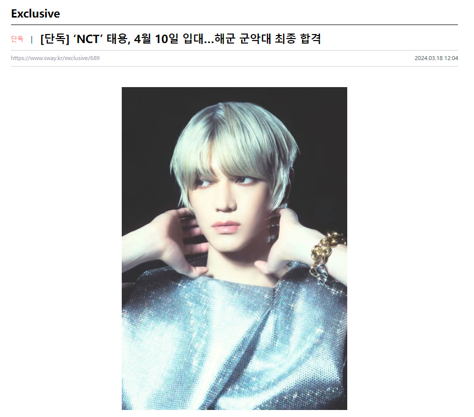韩媒方面18日发文报道称,李泰容将于4月10日进入训练所接受基础军事训练,之后将在海军军乐队履行国防义务,他也是NCT中最先入伍的成员。