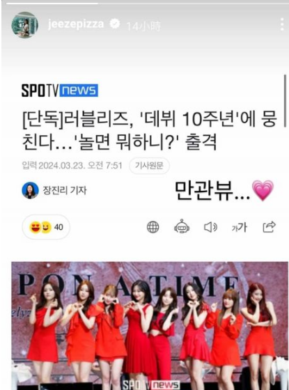 女团Lovelyz 2014年出道,以〈Ah-Choo〉等歌曲闻名,惜於2021年各奔东西,不过成员间仍有密切联络。2022年逢8周年时,成员Baby Soul(李洙姃)、刘智爱、徐智秀、李美珠、Kei、Jin、柳树整与郑睿仁8人曾完整体来到被称为「Lovelyz之父」的音乐制作人尹尚节目,展现满满团魂、掀起回忆。
