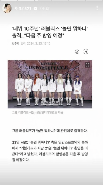 今年是出道第10年,Lovelyz徐智秀曾说想办纪念演唱会、和成员们正在规划,柳树整也说过想要再合体表演或发行专辑的愿望。首先让她们完成合体心愿,就是成员李美珠担任固定班底的节目《玩什么好呢》。