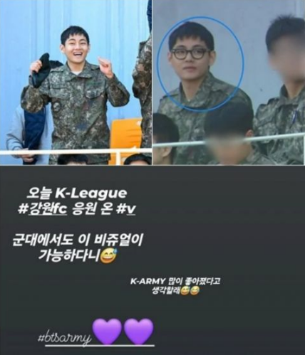 韩网讯/ 日前,全智贤的婆婆通过个人SNS上表示今天来为K-LEAGUE 江原FC加油的V,军队里怎么可能有这种颜值啊,我觉得K-ARMY越来越好了,并公开了V的照片。 照片中V穿着军装,戴著黑框眼镜,站在看台上为球队加油,看得兴奋时还举起了胳膊,现在的他要比之前结实了不少。 这一幕还被电视台直播出来,被不少观众截图,发布在各大论坛上。