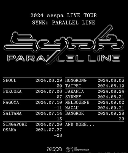 Aespa的第二轮世巡命名《2024 aespa LIVE TOUR - SYNK: PARALLEL LINE》,将从6月29日~30日以首尔为起点正式唱响。并陆续於7月在福冈、名古屋、崎玉、大阪和新加坡;8月在香港、台北、东京、雅加达和雪梨;9月在墨尔本、澳门和曼谷等亚洲、澳大利亚的14座城市举行。