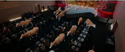 在最近首播的《支配物种》中引发台韩剧迷讨论的莫过於在第一幕的BF记者会上,成群牛只从投影画面跑进观众席的震撼场景。利用3D影像将动物投射在与会来宾的身边,制造出身历其境之感,细腻的特效令人叹为观止。也相当符合本剧设定的未来感与新技术的诞生。剧迷大赞不亏是砸下240亿韩元(约6亿台币) 打造出来的强档大作,华丽的科幻包装下蕴藏著悬疑精彩万分的剧情,也令人期待后续还会有什么惊喜场面。